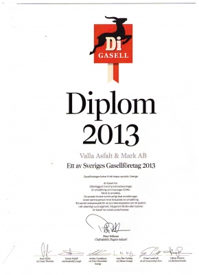 Denna utmärkelse tilldelas endast ca 5% av Sveriges företag och borgar för att Valla asfalt & mark AB är ett företag med bra ekonomi och även att företaget är långsiktigt.